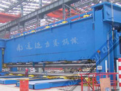 船用三輥對(duì)稱(chēng)式卷板機(jī)結(jié)構(gòu)型式為三輥對(duì)稱(chēng)式,上輥在兩下輥中央對(duì)稱(chēng)位置作垂直升降運(yùn)動(dòng),通過(guò)液壓缸內(nèi)的液壓油作用于活塞桿而獲得,為液壓傳動(dòng);通過(guò)特殊設(shè)計(jì)減速機(jī)分別帶動(dòng)全滾動(dòng)軸承的兩下輥?zhàn)餍D(zhuǎn)運(yùn)動(dòng),為卷制板材提供扭矩;在下輥下部設(shè)有多組托輥,以提高下輥的剛度,并可進(jìn)行垂直調(diào)節(jié);在上輥的上部設(shè)有剛性大梁,在大梁與上輥之間設(shè)有多組托輥,以提高上輥的剛度;適用于超寬圓弧形零件的卷制??删戆搴?mm-50mm,板寬21000mm的板料。